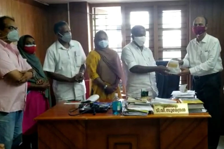 Oximeter handed over by MSS District President TS Nizamuddin to Kadappuram Panchayat President Haseena Tajuddin